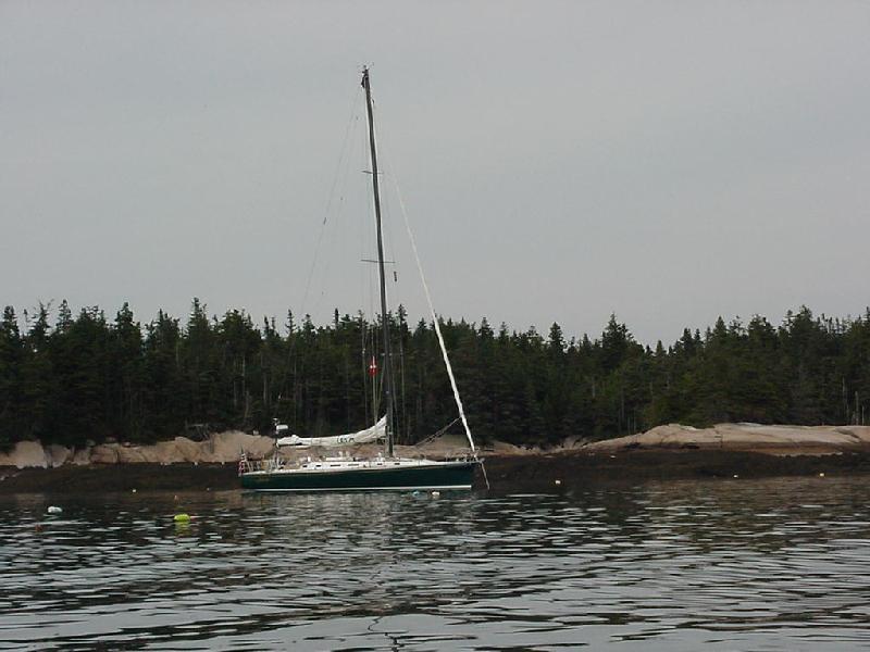 Javelin, above the fray, sailed a beautiful, graceful and peaceful close reach. "Look-ma-no-hands" sailing under instrument control locked Javelin in on the rhumbline using the ebb tide to propel us over the bottom at up to nine knots. Crisp and cool air curled around the dodger, offering the option of sun and warmth at the forward end of the cockpit, or a bracing breeze back aft. As we closed with East Quoddy Head at the north end of Campobello a lobster boat tried to out race us, only to give up after about a mile and turned away to the northwest. We hardened up at the Quoddy Head light and beat southwest through Head Harbour Passage doing about 7 knots. With water depths over 100 feet almost at the rocky shore, we thrilled fishermen and landlubbers alike with tacks within a long stone's throw of the rocks. At Windmill Point we furled the jib, dropped the main and started navigating into the serpentine unnamed bay penetrating Campobello, marked with numerous fish weirs, and ending a mile past the only navigation buoy in the rock-bound pool marked Harbour De Lute. Rick worked the GPS position on the computer, feeding Steve new headings at one-minute intervals. We threaded our way around the weirs, past rock ledges and dropped the hook at low tide in 14 feet of water at 1615. In six hours we would have an additional 16 feet of water to float in, and the rocks and stakes now visible would be hidden at varying depths from benign to deadly.