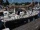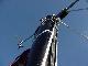 Priscilla doing a little reading, Steve polishing the oil lamp and cleaning the dodger, Jim re-drilling the flag staff to tighten the luff, Rick updating the log. Dinner was defrosting. Wavelets lapped the hull with gentle slaps as the flooding tide turned Javelin 90 degrees to the wind. All was good with the world. So good in fact, that Steve hoisted Rick aloft in the bosun's chair on the main halyard for a picture. From 75 feet off the deck, Javelin stretched gracefully across the dark water, her sleek lines converging at the bow. To the south, our anchorage ended in the calm fingers of water cradling a small wooded island.