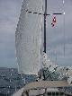 A nice west wind greeted us at breakfast time, but faded away with the heat of the morning as we powered once again westward. First stop was Winter Harbor for fuel, then around into Frenchman Bay and the tiny harbor of Sorrento to find Tony Waldeck and Adrian May. Steve radioed ahead to ask if they would like to go for a sail since the wind had finally come up. They jumped at the chance and climbed aboard as we made a pass alongside. Out in the bay we beat upwind, closing with a nice 30 footer. We tacked astern and to leeward, then sailed right up across her stern and on into Bar Harbor. We met our match, however, as the big catamaran ferry from Yarmouth came roaring in across our path. A picture showed it to be a perfect vessel for 20,000 Leagues Under the Sea. We set the chute and tacked downwind back to Sorrento, the wind failing as we arrived.