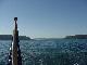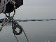 Once again we were visited by things with wings, but this time we wished the chickadee were here to help. Flies, and a number of large moths blew aboard on the wind. Steve attacked with his "Special K' hat, even being so forceful that repairs were necessary to the clasp. This caused Brian some anxiety, since Brian had provided all the crew with these hats named after his boat, and sported an embroidered DCYC flag. When Steve retreated to the nav station below, he was commissioned to use the fly swatter, and soon the air rang with calls of vanquished insects. Those Rick & Brian didn't dispatch themselves on deck, they scared down the hatch were our brave and valiant captain delivered the coup de gras.