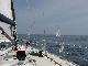 Because the other two J 160s were both deep draft (9 feet vs Javelin's 7), and one was flying a larger jib, each of us started at a different time. Steve sailed us nicely across the line 26 minutes after the first boats had started, with the second J 160 2 minutes, thirty seconds behind us, and the last one another 2.5 minutes back. The smaller boats had started with a modest NW wind blowing through the starting area, and we could see that they had encountered some flat spots before picking up the southwest wind in the ocean.