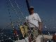 Into The Race with the last of the current on schedule at 1530 with the wind holding about 14 and Javelin galloping for the barn. The Boys alternate on the helm, each having more fun than the next. Out comes the camera to record their homecoming smiles. New London passes abeam, Long Sand Shoal only 2 miles ahead. Brian & Steve are already talking about putting cushions below and hosing down - Steve declares it's too hot to polish the chrome and stainless with Never Dull tonight. Rick runs through the dinner menu in his head, glad that the air conditioning will be running all night tonight while cooking and sleeping.