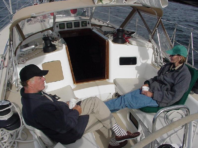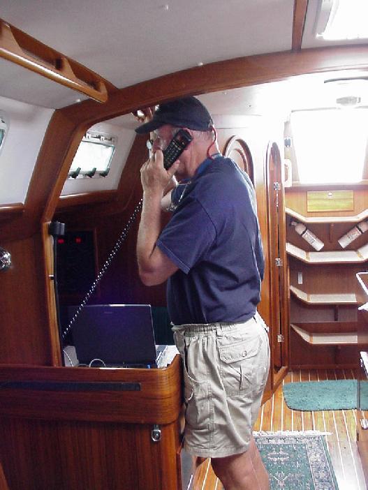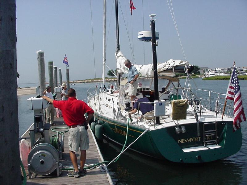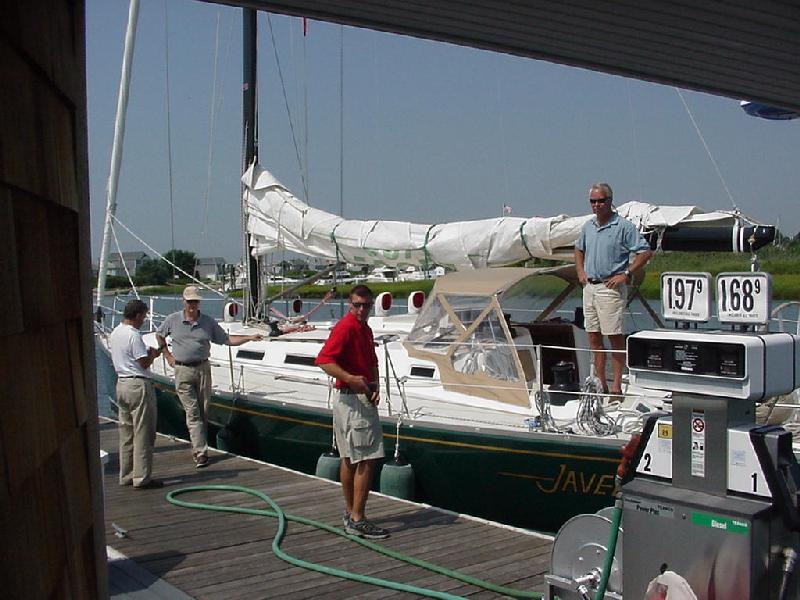 Pulling the electrical shore power cord, coiling it, and stowing it in the aft lazarette was the last task before casting off. Javelin was ready and scrubbed by the yard when, first Jim and Ben arrived and opened up the boat, followed by Steve, Jeff & Rick just after 1000 hours. There wasn't a lot to stow. Duffel bags and the initial food supply were quickly sorted out. One last stop at the fuel dock topped off diesel and pumped the holding tank. By 1100 we were under way.