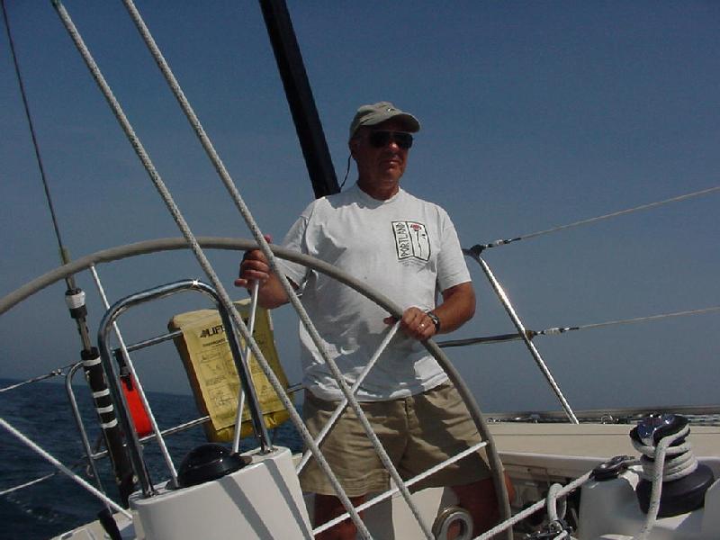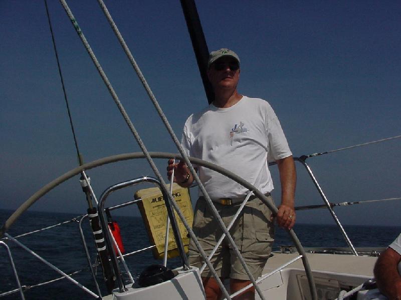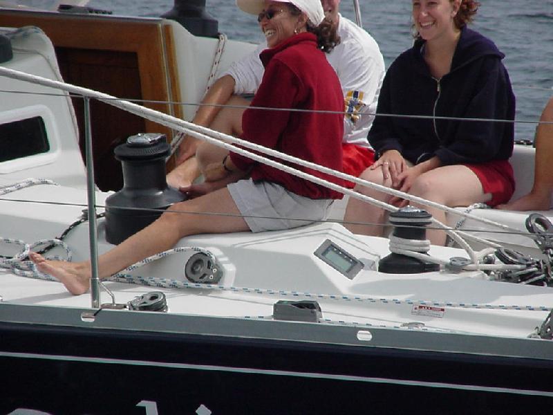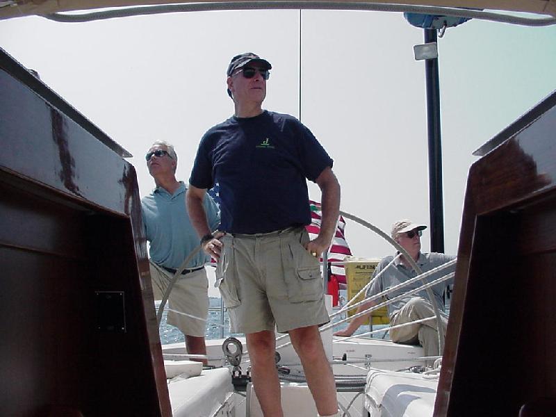 We rounded Little Duck with Excaliber about 4 lengths astern and bore off on the downwind leg to Baker gong. The course was dead downwind - Javelin's worst angle since we were limited to working jibs and no spinnakers for this race. We chose to tack down wind and held to the ocean side of the course for the first 15 minutes. We gybed over and closed with Excaliber, still holding a small lead. The last J 160, September Morning, was flying a large genoa and now was sailing wing and wing straight down the course and gaining on both of us. When we approached the starboard layline, Excaliber gybed first. We crossed just ahead of her, then gybed to take the inside track to the mark. Unfortunately, she was just enough lighter (no generator or air conditioning) to slowly slide ahead. In the exchange, we were sailing within feet of Excalibur's leeward side, and Beth Apold was quite vocally exclaiming that this was the part of racing she didn't like - having big boats so close together - to which her skipper husband Will remarked, "Then go below and cook." Needless to say that remark made it's way around the fleet! When we all converged at the gong, September Morning was about a minute ahead, with Excaliber about 30 seconds ahead of us.