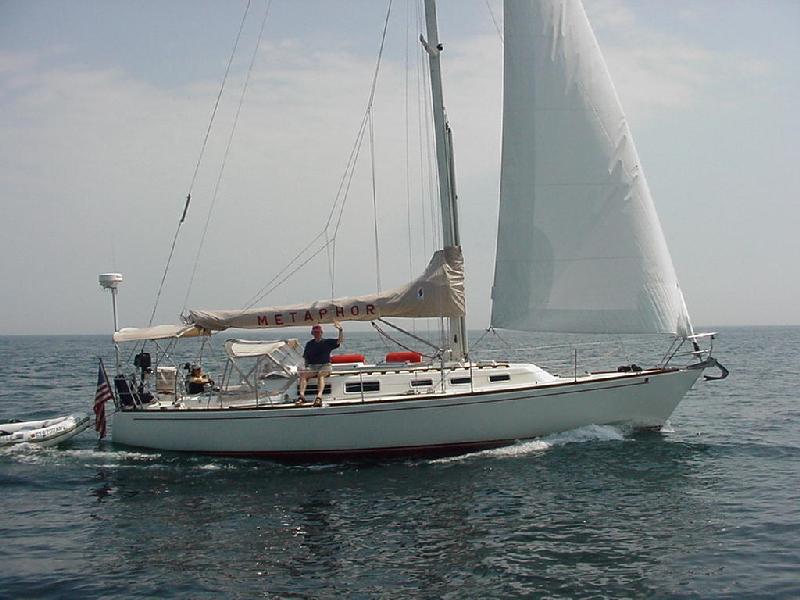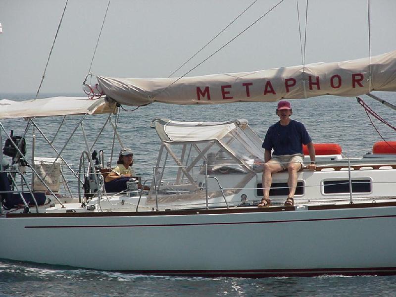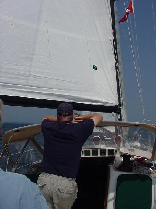 It was once again a race between lunch and overtaking Metaphor. This time the ham & cheese on rye were ready just before we converged. Taking advantage of our being temporarily preoccupied, the wind both increased and moved aft. Steve polished off his sandwich and dashed to attach the main halyard. Not to be so easily fooled, the wind immediately backed off. And we held off hoisting. In fact, it went so light, Steve suggested the only way to trick it was to take the halyard off again.