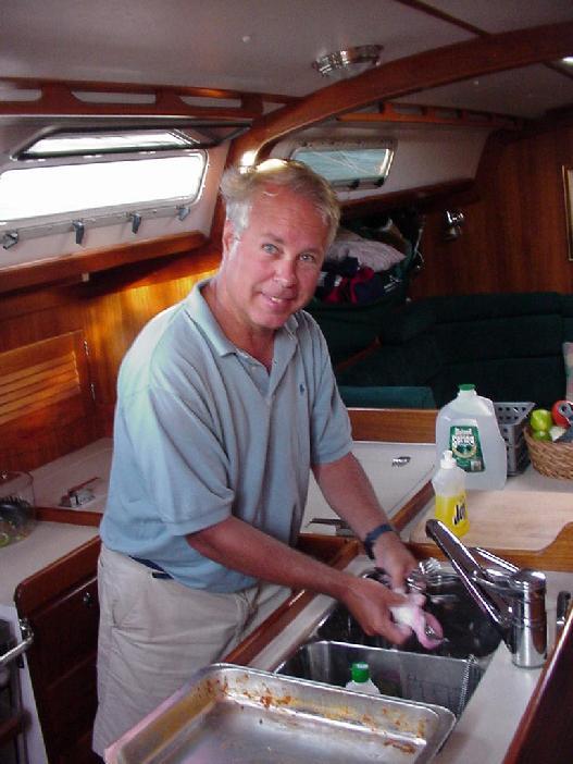 Steve swabbed down the stern, as usual, to banish the back diesel smudges after hours of running under power. Rick attacked the chrome with Never Dull, starting at the stern boarding ladder and working around to the lifeline stanchions and the bow and stern pulpits. Jim & Rick took the risk of making up a shopping list, prior to Priscilla Fulton's afternoon arrival, and then doing the shopping.