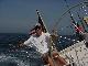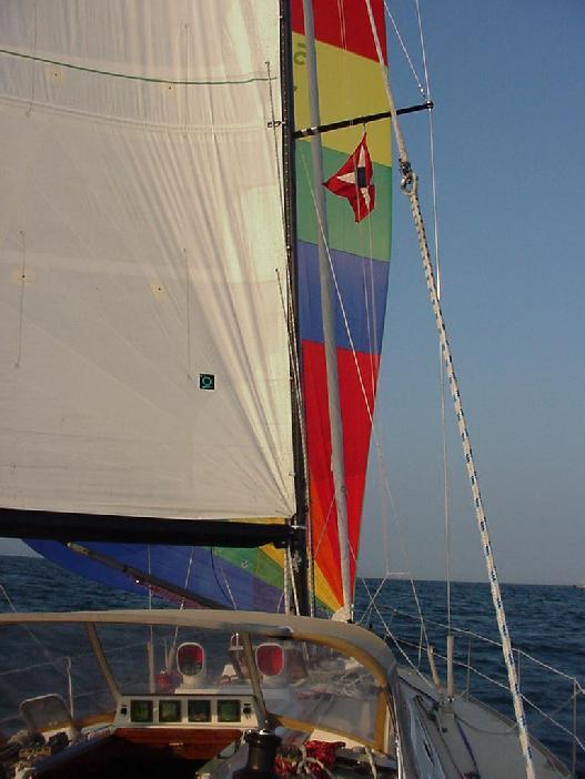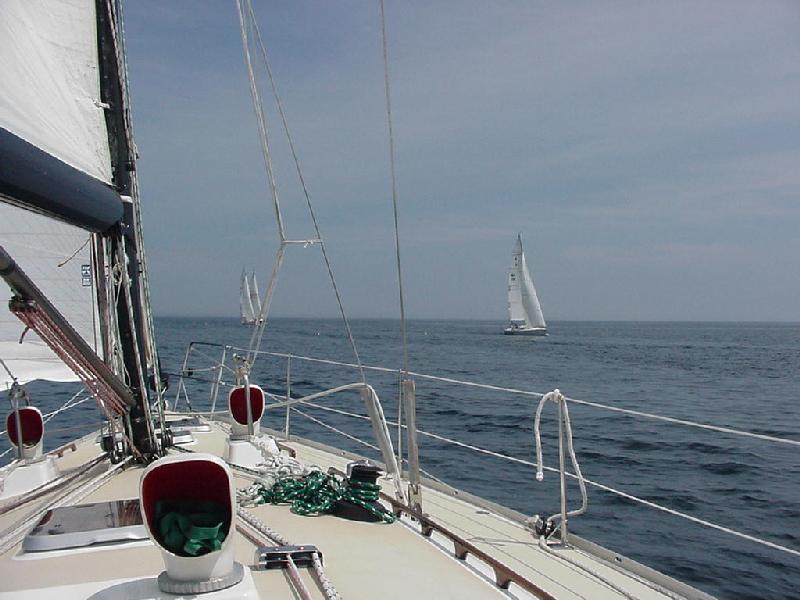 We pulled alongside to leeward at 1213, exchanging greetings, offers for lunch, and snapping pictures. Not really meaning to add insult to injury, we then hoisted the spinnaker and quickly opened the distance between us doing 9+ knots. Rubbing salt into the wounds, Steve then shut down the engine, and we continued on still making over 8 knots and enjoyed a few hours of fine sailing.