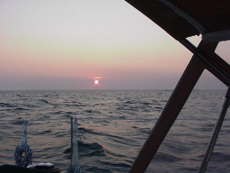 Etched on the radar screen, the rock breakwaters of Pt. Judith Harbor of refuge slid close abeam and astern, unseen though the fog. Then in five minutes, we emerged as through a curtain into a clearing revealing a large schooner offshore, and a few boats beating their way back west. With increased visibility, we set the spinnaker about 1700 and set course for the 20 miles to the entrance to Buzzards Bay. The knot clock hit 11 plus amid celebrations. Jim's lasagna and a big green salad did the trick for dinner. But by 1930 the wind was going aft and dying with the setting sun. So on went the engine, down came the sails, and the off-watch went below.
