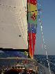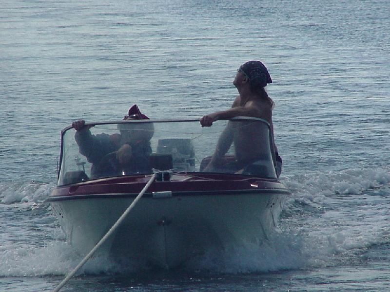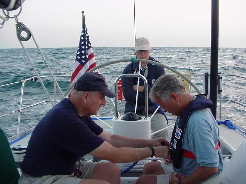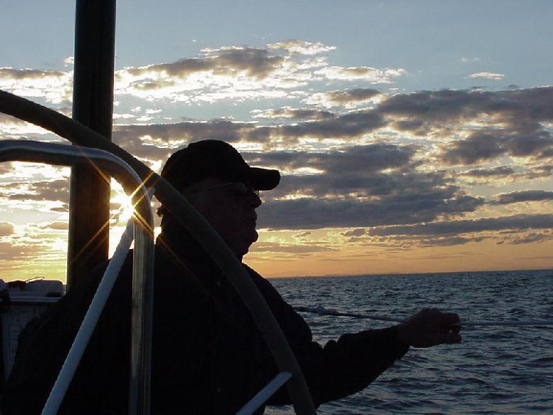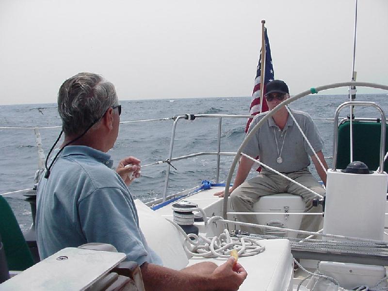 Once again we were visited by things with wings, but this time we wished the chickadee were here to help. Flies, and a number of large moths blew aboard on the wind. Steve attacked with his "Special K' hat, even being so forceful that repairs were necessary to the clasp. This caused Brian some anxiety, since Brian had provided all the crew with these hats named after his boat, and sported an embroidered DCYC flag. When Steve retreated to the nav station below, he was commissioned to use the fly swatter, and soon the air rang with calls of vanquished insects. Those Rick & Brian didn't dispatch themselves on deck, they scared down the hatch were our brave and valiant captain delivered the coup de gras.
