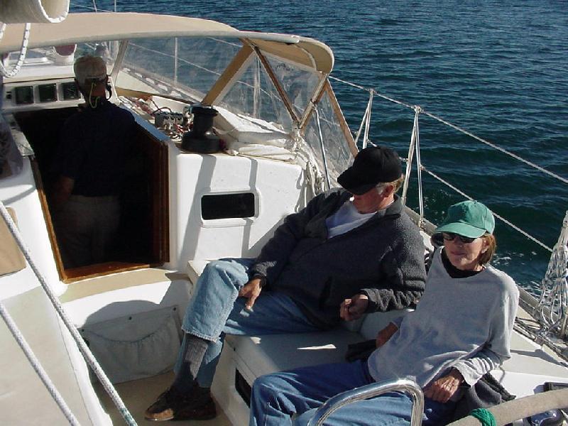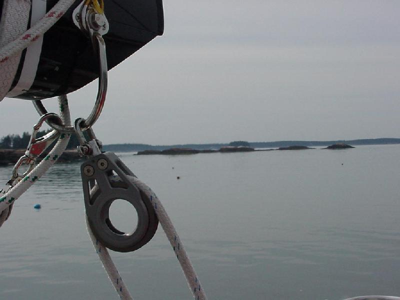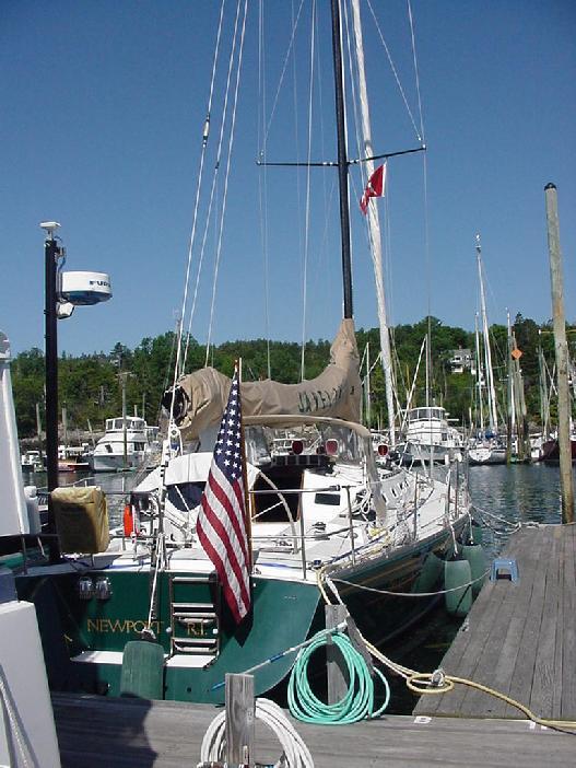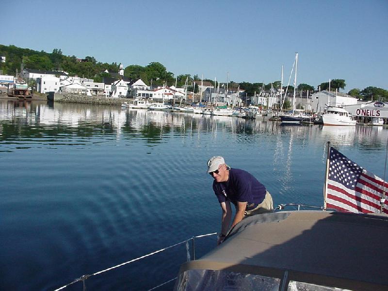All hands stirred by about 0830. Scrambled eggs, OJ, coffee, English Muffins, and a wonderful assortment of sweet rolls and muffins, compliments of Jeff's quick trip to the bakery, filled the inner man. Fortified, ships chores were started. The main was nicely flaked and the cover tied on Bristol fashion. On Monday night, when the jib was slatting behind the main and sailing wing and wing, the pin had dropped out of the tack shackle and a small tear had started at the bottom of the luff tape. It had been tied down and taped, but now a proper repair was completed when Jim found the right size pin at Brown's hardware. Jeff and Ben rented their car and departed about 1030, allowing time for a short tour of the countryside and Cadillac Mountain before catching their plane at Bar Harbor at 1400.