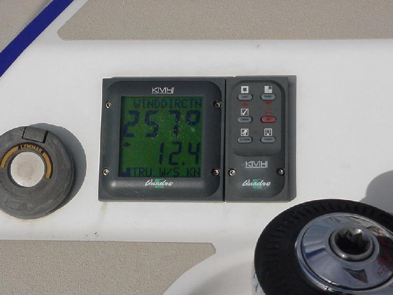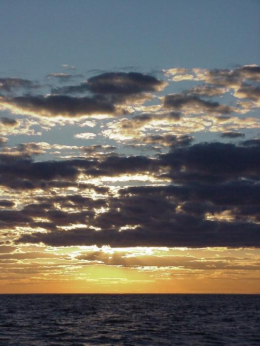 We were still racing down the growing seas hitting 11, 12 and occasionally 13. With increasing wave height, the bow buried more, and the steering effort increased. Mother Nature then made her move with hazy stratus pouring across the sun and darkening the northwestern sky and obliterating the horizon. Good time to take down the main! Nicely accomplished with only one wave aboard, we sailed on under jib and throttled back engine, still hitting 9 and an occasional 10 knots.