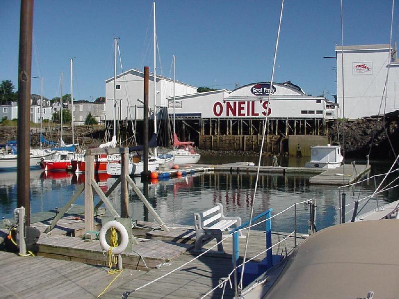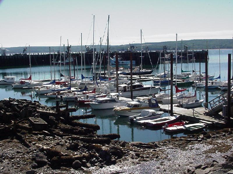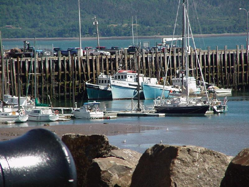 Four hours of sleep recharged our batteries, and soon Steve was on the radio trying to contact the Digby marina. A tour boat operator responded and directed us to a berth at the end of a marina dock, now visible in the morning sun. As we worked our way the short distance in, we realized we were already inside the "farther" set of docks indicated on the chart. We later learned that the original dock had been removed about 6 years ago, and the "last" mark had been moved to the end of the remaining dock. None of which was shown accurately on the Canadian chart stamped "updated to 1999-09-10". Digby is on Atlantic time, an hour ahead of Maine, so the morning was fast escaping. Steve called to inquire about the rental car he had reserved, only to find it had been delivered and parked in the parking lot at the head of the dock earlier in the morning and the keys were over the visor.