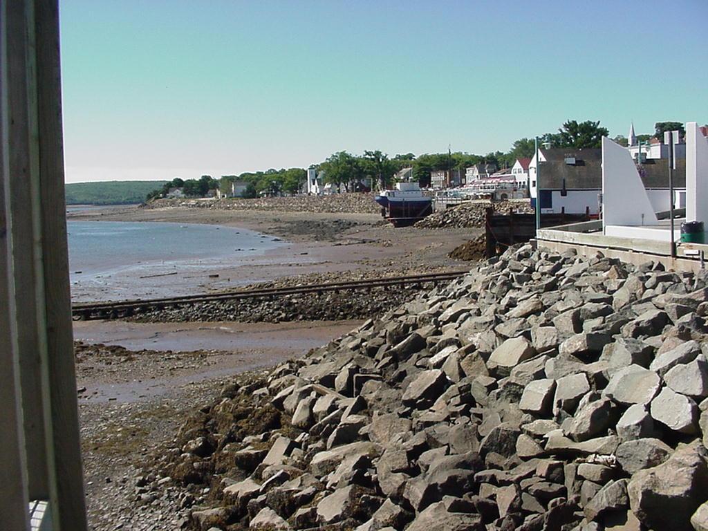 A dreamer might have been tempted by the real estate page on the wall, complete with description, picture of the building, and a price of $59,000. Outside, the boys, waiting for Priscilla's transaction to be completed, remarked at the peeling paint, and weathered cornices. Rick posed the question of how far a screwdriver might penetrate the wood, to which Jim calmly replied, "To the handle." We retreated the 6 clicks downriver, now almost dry at low tide, to highway 1 and continued toward Annapolis Royal. The way was dotted with the tiny linear towns of Cornwallis, Clementsport, and Upper Clements each like the last with small houses of peaked roofs, most with weathered wood siding.