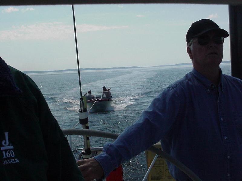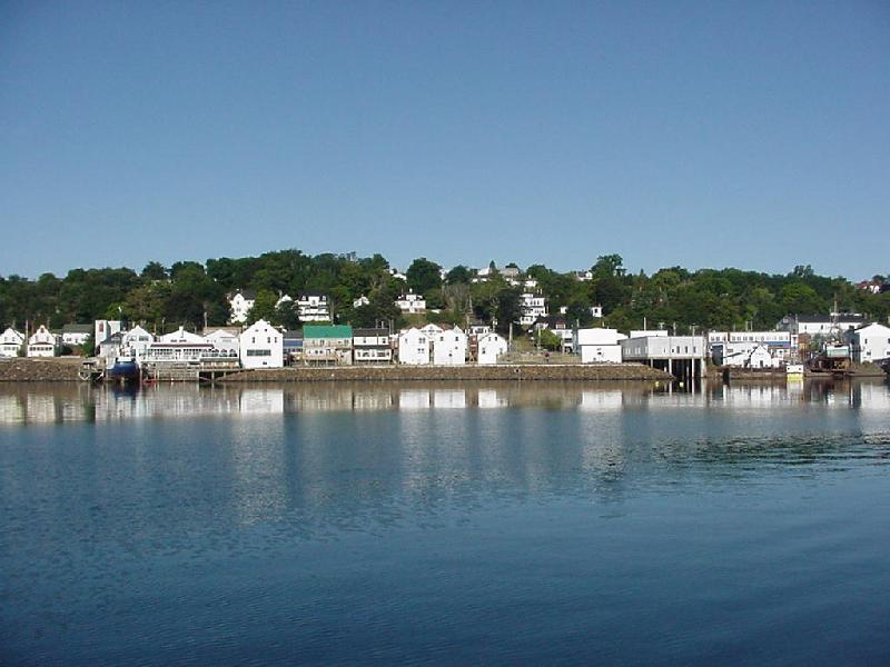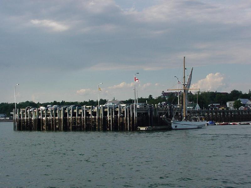 Breakfast was the do-it-yourself variety, and late by cruise standards. It was 0930 Atlantic time before we slowly pulled up the anchor. Our secure stay was accomplished by an anchor and chain well buried in mud. Fortunately, Javelin's pressure sea-water hose forward enabled us to blast away the mud, link by link, as the chain came aboard. Retracing our waypoints, we headed for St. Andrews. Light winds, under power, we worked our way around Deer Island, running parallel to and just east of the US-Canadian border, letting the autopilot do most of the work. Ahead a small runabout with two men aboard was waving an oar in the air. We slowed down and learned they had run out of gas, and we took them in tow, we thought for St. Andrews. As they realized our destination, they waved and explained that it would be better for them to be at their home dock at Robbinston on the US side of the border. We powered the extra 6 miles with them in tow and dropped them at their dock before turning back around Navy Island into St. Andrews Harbour. A pod of dolphins gamboled around us as we went.