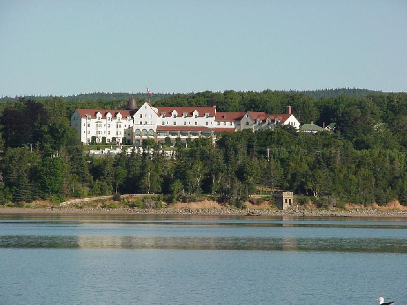 Our reservation turned out to be a mooring, not the dock we had anticipated - there were no docks to tie up to other than the limited space for charter boats to take folks whale watching off Campobello Island. We inflated the rubber dinghy and headed ashore after a chicken chow mein lunch. Steve and Jim remarked at how the town had been improved since their last visit ten years (or more) ago. It was clearly set up for tourists with shops along Water street in fresh coats of paint, flags on the lightposts, and knickknacks for sale at every door. We walked on up the hill to the Algonquin Hotel and enjoyed iced tea and lemonade on the balcony. On the way down we looked at several churches. For a town of about 1800 souls, they had at least six churches - maybe lots of saving to do. St. Andrews was founded by British Loyalists who had lived in Castine, Maine but did not want to be part of the revolution. So they packed up their houses, some literally, moved north and re-erected them in St. Andrews, Canada.
