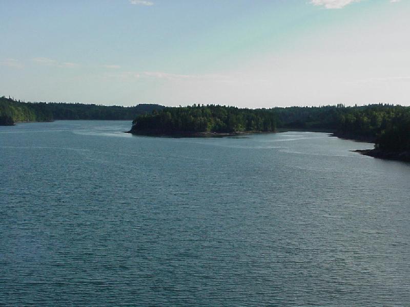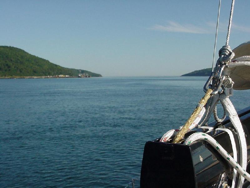 A hearty spaghetti dinner fortified the crew as we carried our watch system into the evening. By midnight we had entered and crossed the commercial traffic lanes to and from St. John, checking in with Fundy Traffic Control by VHF radio on the inbound and outbound edges. The quarter moon set a little before midnight, leaving a spectacular star show under a crisp, clear sky. Though a northwest wind had finally blown in and we could have set sail, the tide had now turned and we were making 11 knots over the bottom on an even keel under power - a very easy ride for the two-person watches on deck. We closed slowly at a narrow angle with the Canadian shore. The visibility was so crisp that shore seemed almost alongside even when we were still 5 miles off.