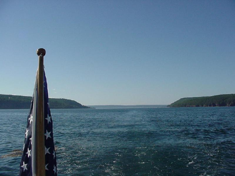 An early start left St. Andrews astern by 0730. A glassy morning under power against the incoming tide across Passamaquoddy Bay and again down along the US - Canadian border, still on the Canadian side. A seal looked us over before going on about its morning hunt. Rounding East Quoddy Head the Bay of Fundy looked most like an ice rink, rimmed on the eastern side with a white fog bank on the horizon. A light breeze filled in and Steve ordered all sail set. Up went the main, then the spinnaker. But once again the wind gods were scared away and departed leaving us to drop sail and return to engine power. The current had now turned in our favor, so we rolled down the coast doing about 10 knots over the bottom.