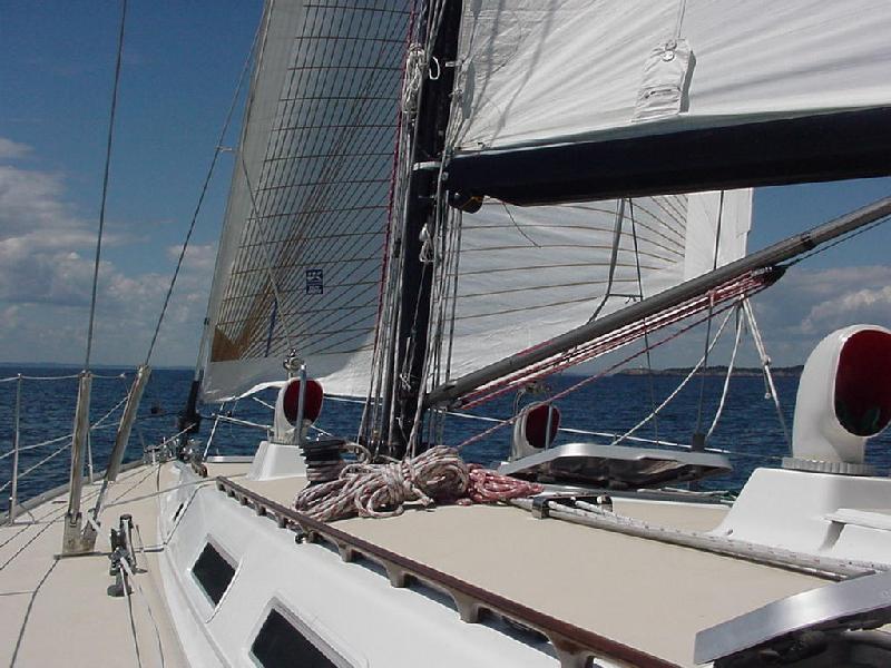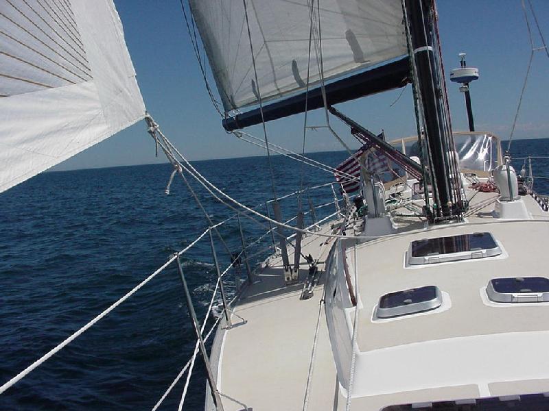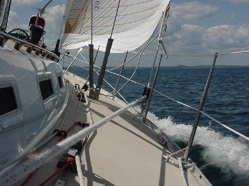 It worked about half an hour later. With sails set we roared down the course at 8.7 through the water and 9.4 over the ground. We rigged the block and short sheet to lead the jib to the rail and sat back for a great sail. Mother Nature didn't take too kindly to our expectations, and slowly went light and forward again. In came the jib, though we kept the main up and started the engine. Seeing that we were determined to keep on schedule, even without their help, the wind gods relented and again filled in with a nice 12 knots. Out rolled the jib and off we went at 9 knots, still on schedule to slip through The Race with the last of the flood tide at 1530. At this rate, an 1800 arrival at Westbrook is still the ETA.