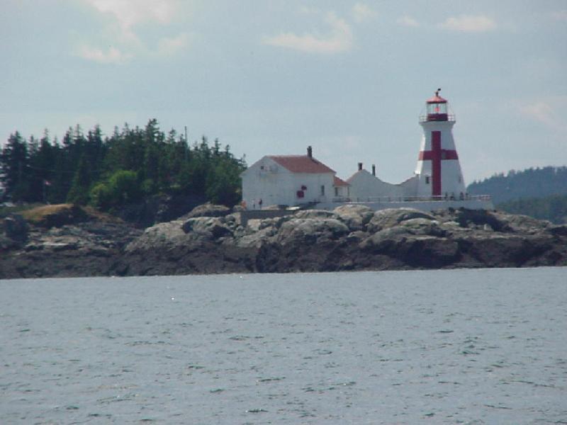 Steve was determined to sail, and hardly had we cleared Lewis Rock when we set the main in about 7 knots of wind. With the wind aft we added the asymmetrical spinnaker and surged to almost wind speed. A pair of dolphins loped across our bow, perhaps a good omen. But, alas, the wind gods were not cooperating, first shifting forward, then aft, then going light. With 100 miles still ahead, we returned to engine power and headed off into the afternoon. Slowly we edged off the shore, giving great evidence to the expression of going "down East" in Maine. In the clearing air behind the rain, visibility was exceptional. Grand Manan Island, and other features appeared around the horizon at distances of 20 to 40 miles. Around 1600 we were approaching our Gannet Rock waypoint at the southern edge of the shoals south of Grand Manan. Tidal flow out of the Bay of Fundy here in the open ocean was just over 3 knots against us, dropping our speed over the bottom to around 4.7 knots, though the boat speed through the water was 8 knots.