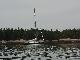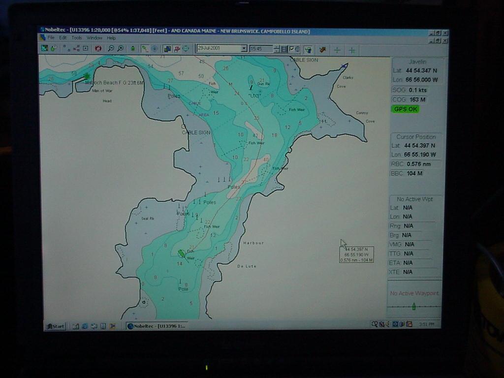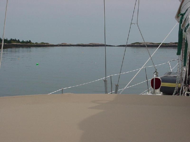 Javelin, above the fray, sailed a beautiful, graceful and peaceful close reach. "Look-ma-no-hands" sailing under instrument control locked Javelin in on the rhumbline using the ebb tide to propel us over the bottom at up to nine knots. Crisp and cool air curled around the dodger, offering the option of sun and warmth at the forward end of the cockpit, or a bracing breeze back aft. As we closed with East Quoddy Head at the north end of Campobello a lobster boat tried to out race us, only to give up after about a mile and turned away to the northwest. We hardened up at the Quoddy Head light and beat southwest through Head Harbour Passage doing about 7 knots. With water depths over 100 feet almost at the rocky shore, we thrilled fishermen and landlubbers alike with tacks within a long stone's throw of the rocks. At Windmill Point we furled the jib, dropped the main and started navigating into the serpentine unnamed bay penetrating Campobello, marked with numerous fish weirs, and ending a mile past the only navigation buoy in the rock-bound pool marked Harbour De Lute. Rick worked the GPS position on the computer, feeding Steve new headings at one-minute intervals. We threaded our way around the weirs, past rock ledges and dropped the hook at low tide in 14 feet of water at 1615. In six hours we would have an additional 16 feet of water to float in, and the rocks and stakes now visible would be hidden at varying depths from benign to deadly.