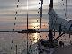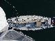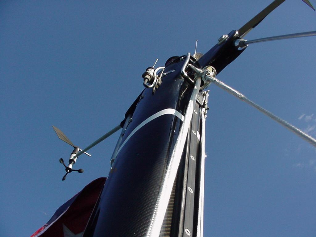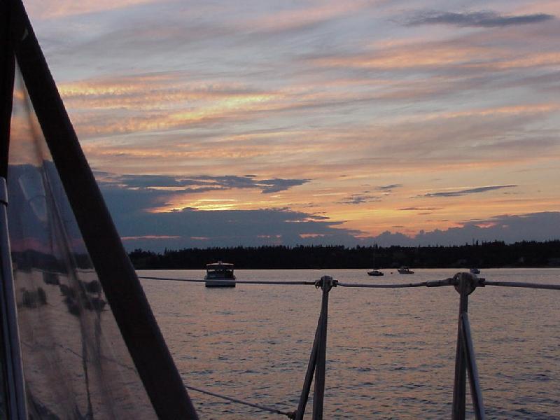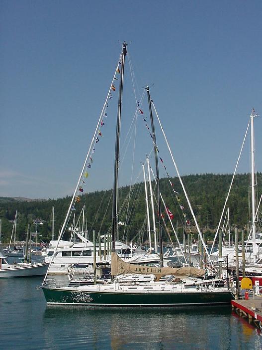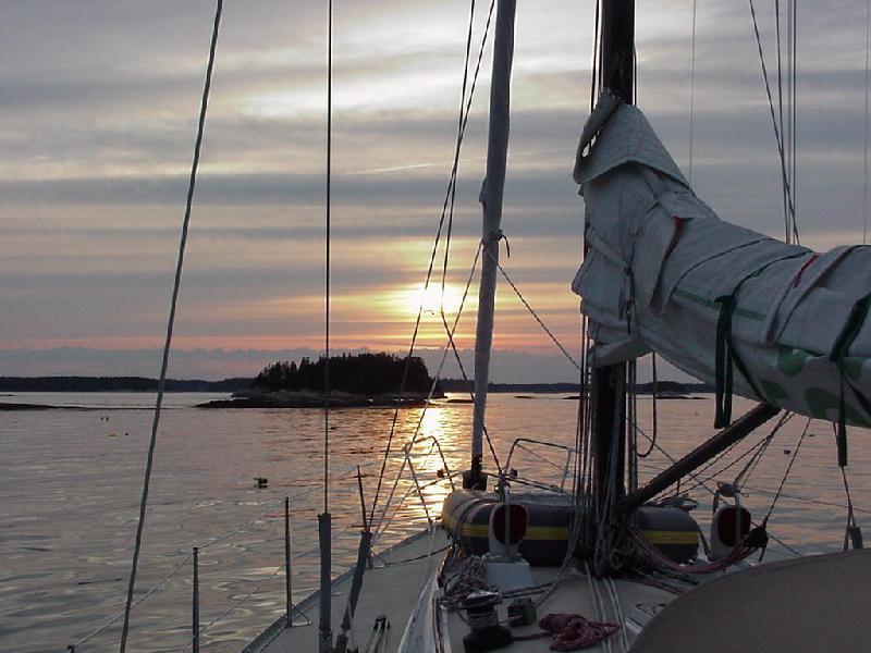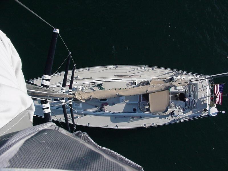 Priscilla doing a little reading, Steve polishing the oil lamp and cleaning the dodger, Jim re-drilling the flag staff to tighten the luff, Rick updating the log. Dinner was defrosting. Wavelets lapped the hull with gentle slaps as the flooding tide turned Javelin 90 degrees to the wind. All was good with the world. So good in fact, that Steve hoisted Rick aloft in the bosun's chair on the main halyard for a picture. From 75 feet off the deck, Javelin stretched gracefully across the dark water, her sleek lines converging at the bow. To the south, our anchorage ended in the calm fingers of water cradling a small wooded island.