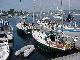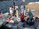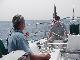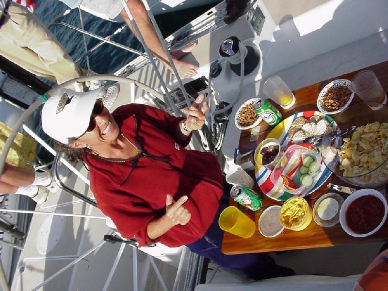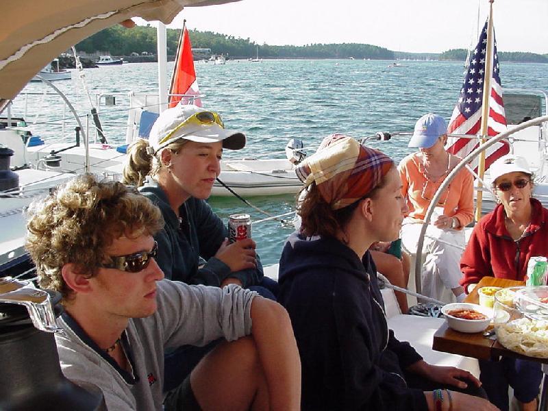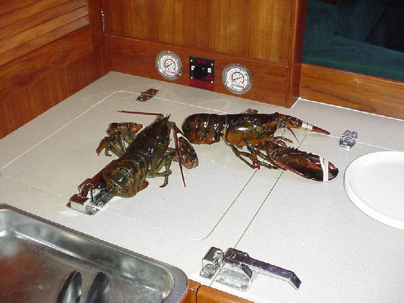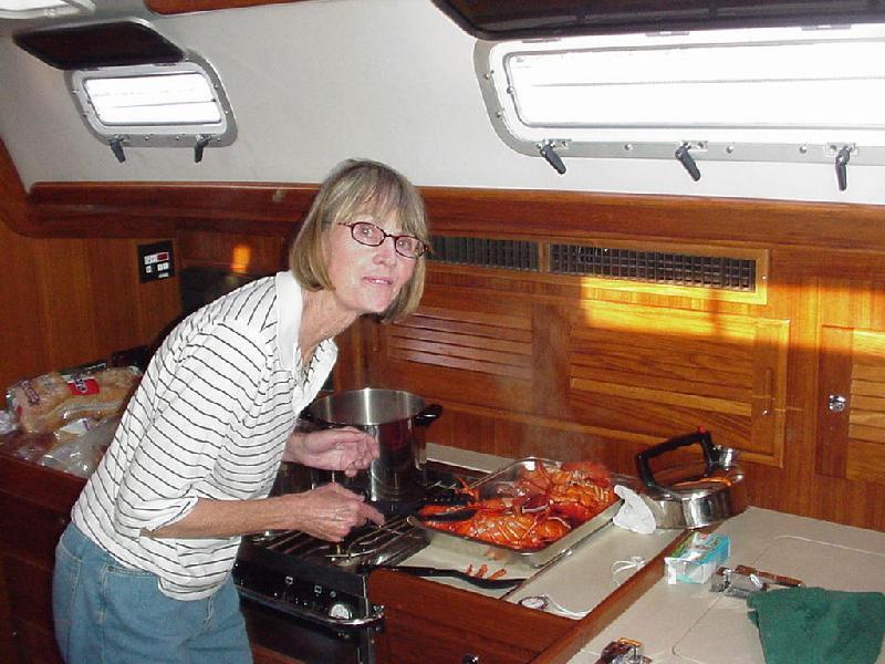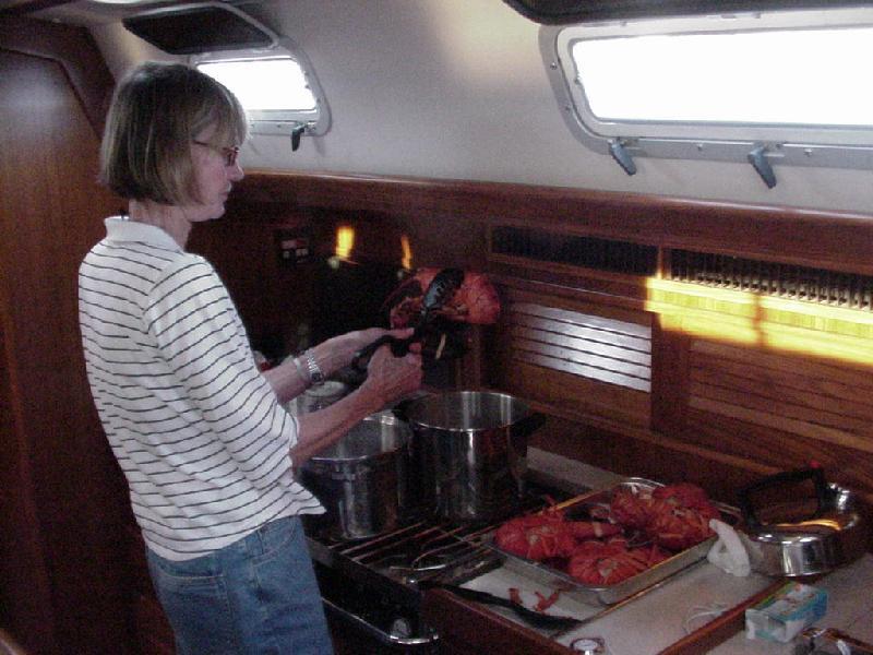 Our shore brigade split up, with Jim & Steve headed more directly back to the boat, picking up fresh lobster along the way, while Rick & Priscilla ransacked the local market to replenish provisions for the next three days. Back aboard it was time for relaxation and log writing before Priscilla dispatched the lobsters in two large steaming pots. Recording the cooking and the table for posterity, we devoured the crustaceans with glee. Satiated, we again "went to the movies" to watch the Andrea Gail sink into the eternity of The Perfect Storm. And so to bed, perchance to dream.