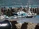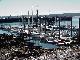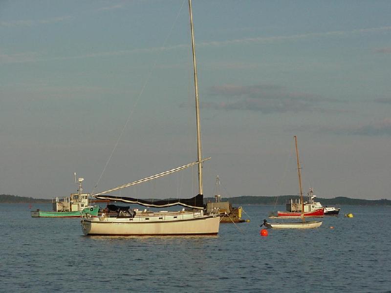 It didn't take long for Steve, working below with the radar and GPS, to realize that our waypoints were not taking us where we expected to go and determined that the chart from which we had taken our points was based on an older geographic datum than the GPS. The major channel marks were easily found, and we closed in on the expected Dibgy wharf at 0245. With the last mark passed, Steve wanted to continue to the "next" finger of dock indicated on the chart. Rick thought that route looked like it had street lights and houses to contend with. The fathometer had dropped from 300 feet coming through the Gut to 75, then to 45 and now showed about 20 feet. Not bad, but Dibgy harbor has a 28 foot tide, and we were already well on our way toward high tide. Steve spotted a mooring buoy off the end of the dock we had just passed, so we swung around and secured for the night about 150 feet off the dock, near a well-used scallop boat. We all turned in for a few hours sleep, though Rick surprised Sandy with a call at midnight California time just as she returned home from her usual Thursday night chorus rehearsal practice.