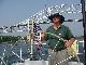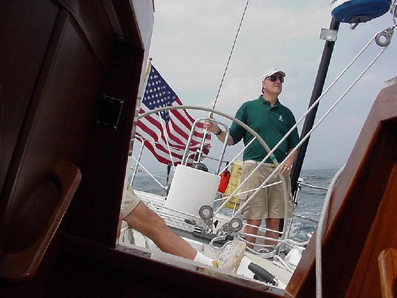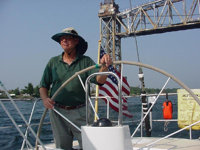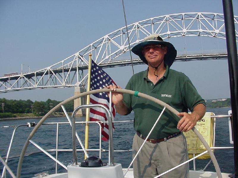 Into The Race with the last of the current on schedule at 1530 with the wind holding about 14 and Javelin galloping for the barn. The Boys alternate on the helm, each having more fun than the next. Out comes the camera to record their homecoming smiles. New London passes abeam, Long Sand Shoal only 2 miles ahead. Brian & Steve are already talking about putting cushions below and hosing down - Steve declares it's too hot to polish the chrome and stainless with Never Dull tonight. Rick runs through the dinner menu in his head, glad that the air conditioning will be running all night tonight while cooking and sleeping.