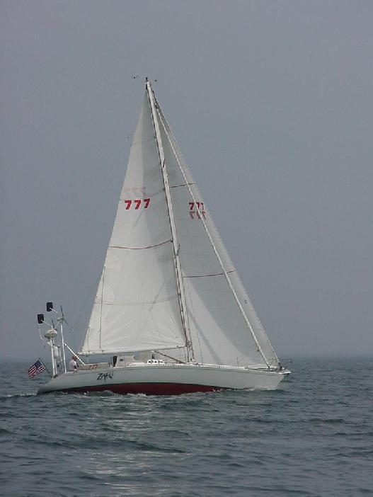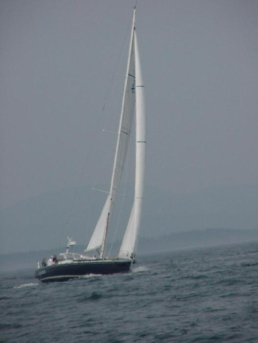 But things don't always work out that way. We should have known that Bob would have a few tricks up his sleeve. Returning past Sutton for the leg through Southwest Harbor, it looked like the little boats were running out of wind and reaching up for speed. We played a streak along the side of Sutton, on a direct course to the next mark. But as our wind died, the leading boats picked up a southwesterly coming in from Western Way and disappeared into the fog. We slatted, then picked up a little and inched away from five boats we had already passed. With our taller rig, we quickly picked up speed and left them slatting a mile astern as we took aim at the boats ahead.