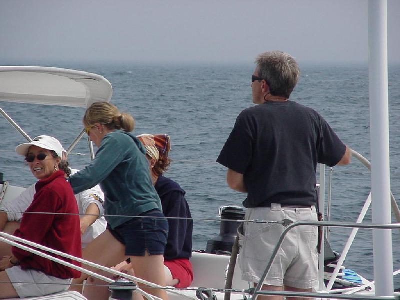 A nice west wind greeted us at breakfast time, but faded away with the heat of the morning as we powered once again westward. First stop was Winter Harbor for fuel, then around into Frenchman Bay and the tiny harbor of Sorrento to find Tony Waldeck and Adrian May. Steve radioed ahead to ask if they would like to go for a sail since the wind had finally come up. They jumped at the chance and climbed aboard as we made a pass alongside. Out in the bay we beat upwind, closing with a nice 30 footer. We tacked astern and to leeward, then sailed right up across her stern and on into Bar Harbor. We met our match, however, as the big catamaran ferry from Yarmouth came roaring in across our path. A picture showed it to be a perfect vessel for 20,000 Leagues Under the Sea. We set the chute and tacked downwind back to Sorrento, the wind failing as we arrived.