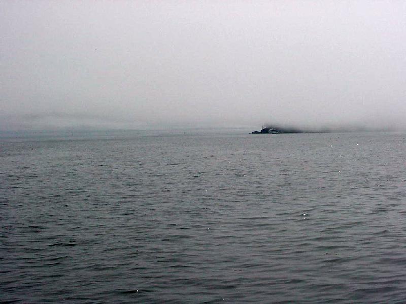 Rick rolled out of his bunk at 0545, dressed and had the coffee water on by 0600 while Steve was washing up and Brian was stirring. A long 80+ mile day lay ahead, down around Cape Ann, past Boston, and into and through the Cape Cod Canal. Ideal target time at the canal would be 1600 to catch the maximum current west into Buzzards Bay. By 0643 breakfast was done, water and power connections stowed, lines cast off and we were under way. Glassy swells and a light fog started the trip. Half way down the 26 miles to Cape Ann, we set sails along with the motor to pick up a few tenths - and help to make that target arrival. The wind was still light, 7-8 knots, but being the compulsive racers we are, we still wanted that extra tenth of a knot. Unspoken, but perhaps a part of it was working to catch up with Arnie & Ronna's Metaphor who had departed about an hour ahead of us and were originally about eight miles ahead.