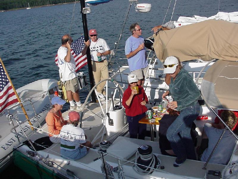 Our sister ship Excalibur, who had pleasure sailed for the day, tied up alongside to starboard, while Maine Sail, Dick Green and Paula Ray's J 42, tied up to port. John and Amy McKenna, from the J 37 Zafu, climbed aboard from their dinghy, and we laid out an impromptu cocktail party until it was time to go ashore for the 6 pm official rendezvous dinner. A wonderful beef and salmon dinner was catered by Jonathan's Restaurant of Blue Hill, and held in one of the boatyard sheds.