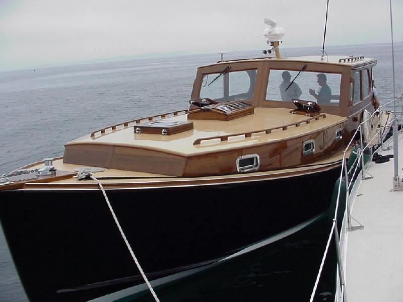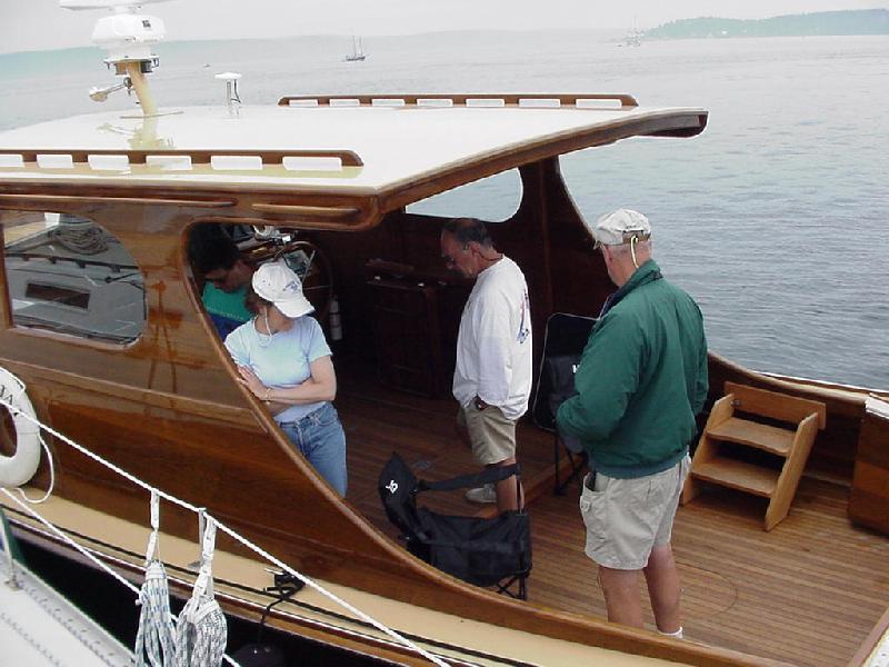 Even at the head of Somes Sound the fog was just above the masthead, and steadily lowered as we departed at 0800 for our rendezvous with Mel & Molly Converse in Castine. We picked our way from waypoint to waypoint with the autopilot, dodging lobster pots continuously out through Western Way, across Blue Hill Bay, Casco Passage, and the turn up Eggemoggin Reach. By then the fog had lifted enough to see shore on both sides as we approached the Eggemoggin bridge. Mathematics said our 75 foot mast, plus two feet of antennas and wind instruments would slide under the 85' bridge clearance, but we still approached at the center of the span at dead slow speed to slip under. Just beyond Buck's Harbor, we rendezvoused with Dan & Nancy Paduano's brand new 38 foot power boat Top Hat. She is a custom 38' cruiser built on an extended lobster boat hull with extensive woodwork in the style of power yachts from the 1940s. The beautiful skylight and round portholes gleamed with many coats of varnish, as did all of the woodwork aboard.