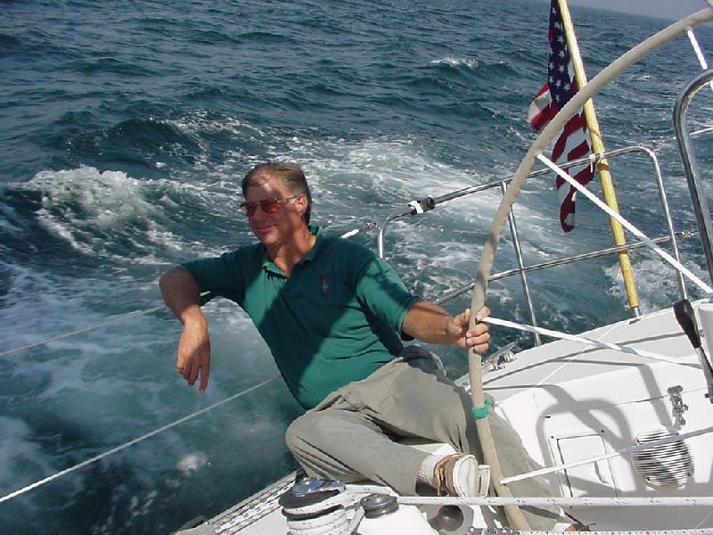 Waking in his bunk below for the midnight to 0400 watch, Rick felt like the boat was quietly sailing along at a leisurely pace. On deck, it was blowing 21 knots and Javelin was reeling off an easy 9 and 10 knots. It was warm enough for a T-shirt, coupled with wet gear pants for a little warmth and to ward off the settling dew. The next waypoint was off Race Point, the far end of Cape Cod beyond Provincetown. Slowly the wind went farther and farther aft, the jib would get blanketed behind the main, and we slowed down. For a while we wung out the jib to weather, but the dying wind, remaining sea, and a dead aft breeze forced us to furl the jib and return to the engine.