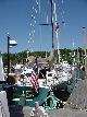Under way at 0630, we pushed the 15 miles back to Northeast Harbor so Jim and Priscilla could reclaim their car and drive seven hours home in time to host guests for dinner. Steve and Rick turned to with bucket and brush to scrub Javelin fore and aft. Having done the deck and cockpit, we scrubbed the topsides, then turned the boat around to do the other side. Hank Jonas arrived just as we were finishing - and offered to help! Hank stowed his gear, we took an iced tea break, then headed up to the Pine Tree Market to do double duty - laundry in the basement and shopping at street level. Clean and restocked, we were ready for lunch and the beginning of the J Boat Rendezvous. So ready, that Steve had all hands dress ship for the occasion.